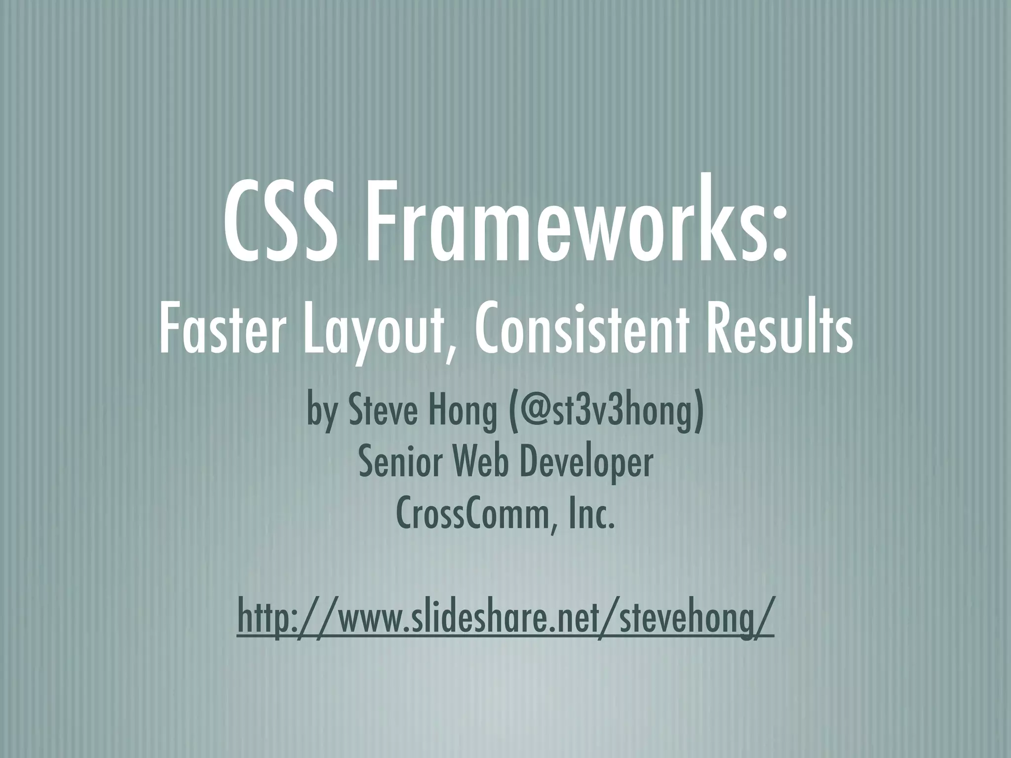 The document discusses the advantages and disadvantages of using CSS frameworks, highlighting that they can speed up development and provide consistency across projects while also having a learning curve and potential code bloat. It lists various CSS frameworks, including those for resetting browsers and layout purposes, and provides examples like YUI, Tripoli, and Blueprint. Additionally, it mentions frameworks for specific needs, such as Formy for form management and Hartija for print styles.