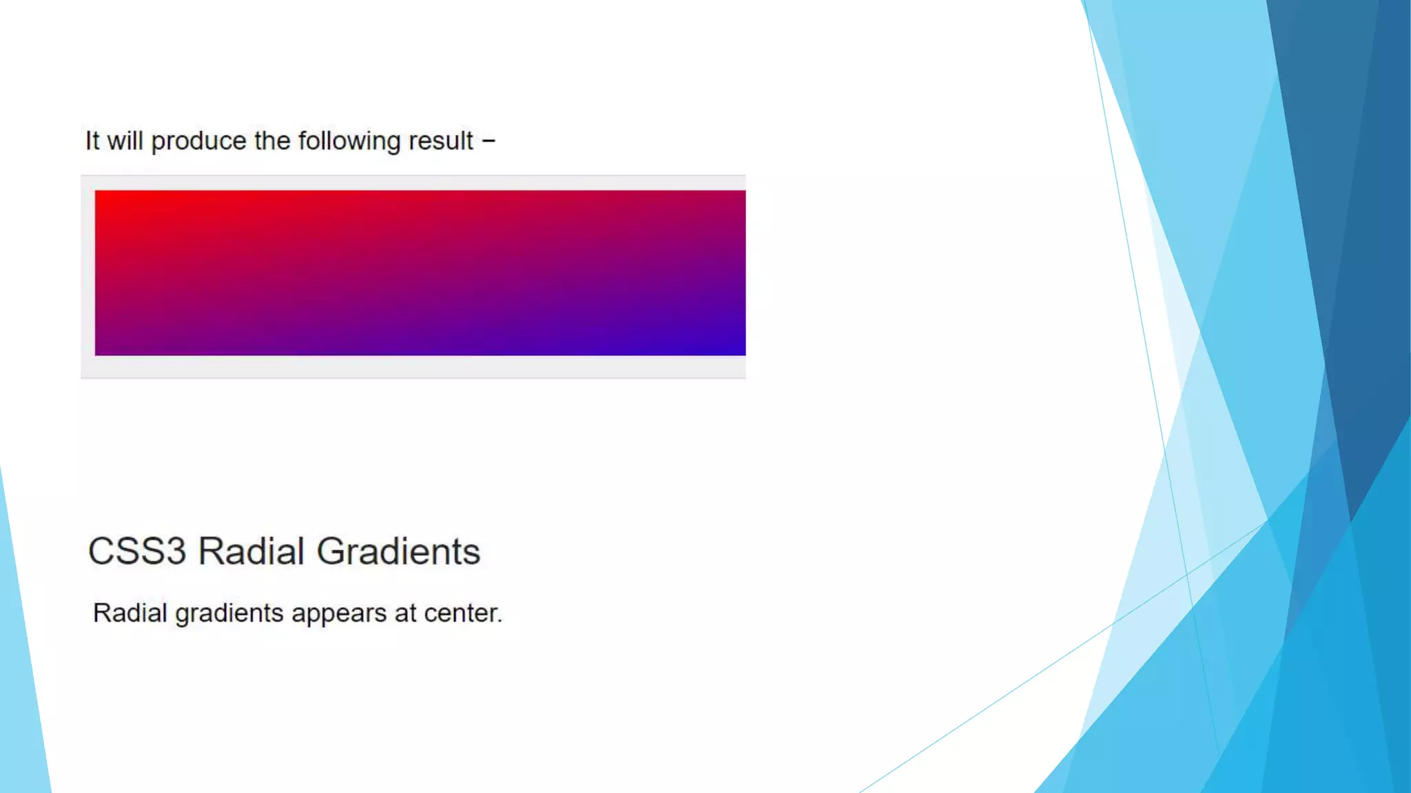 The document discusses using CSS gradients to create color transitions and patterns in web page elements. It provides examples of linear gradients that transition between two colors from top to bottom and from left to right. It also demonstrates radial gradients that blend colors in concentric circles and repeating radial gradients that tile blended color circles. The gradients are defined using browser-prefixed CSS properties and the linear-gradient, radial-gradient, and repeating-radial-gradient functions.