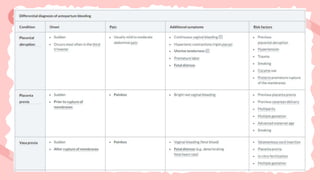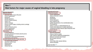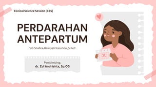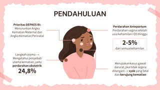 Perdarahan antepartum setelah usia kehamilan >20 minggu adalah kondisi gawat darurat yang dapat menyebabkan kematian maternal dan perinatal jika tidak ditangani dengan cepat. Faktor risiko termasuk plasenta previa dan solusio plasenta, keduanya memerlukan evaluasi dan pengelolaan yang tepat untuk menurunkan angka kematian. Diagnosis dini dan peningkatan kesadaran terkait gejala bisa membantu dalam penanganan yang efektif.