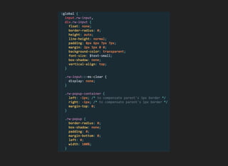 This document discusses CSS Modules, a tool that allows for local scoping of CSS styles and prevents conflicts from globally scoped CSS. CSS Modules is supported out of the box with Webpack and generates unique class names to avoid collisions. It also supports theming components by changing class names and can be used for server-side rendering with a require hook for CSS Modules.