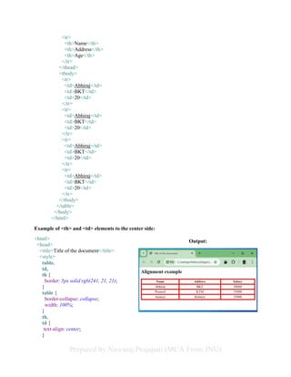 The document provides an overview of using CSS to style HTML tables and elements within a web page. It covers various CSS properties such as border, padding, margin, background color, text alignment, and positioning, along with examples illustrating their application. Additionally, it explains the CSS box model and different positioning methods, including static, fixed, relative, and absolute positioning.
