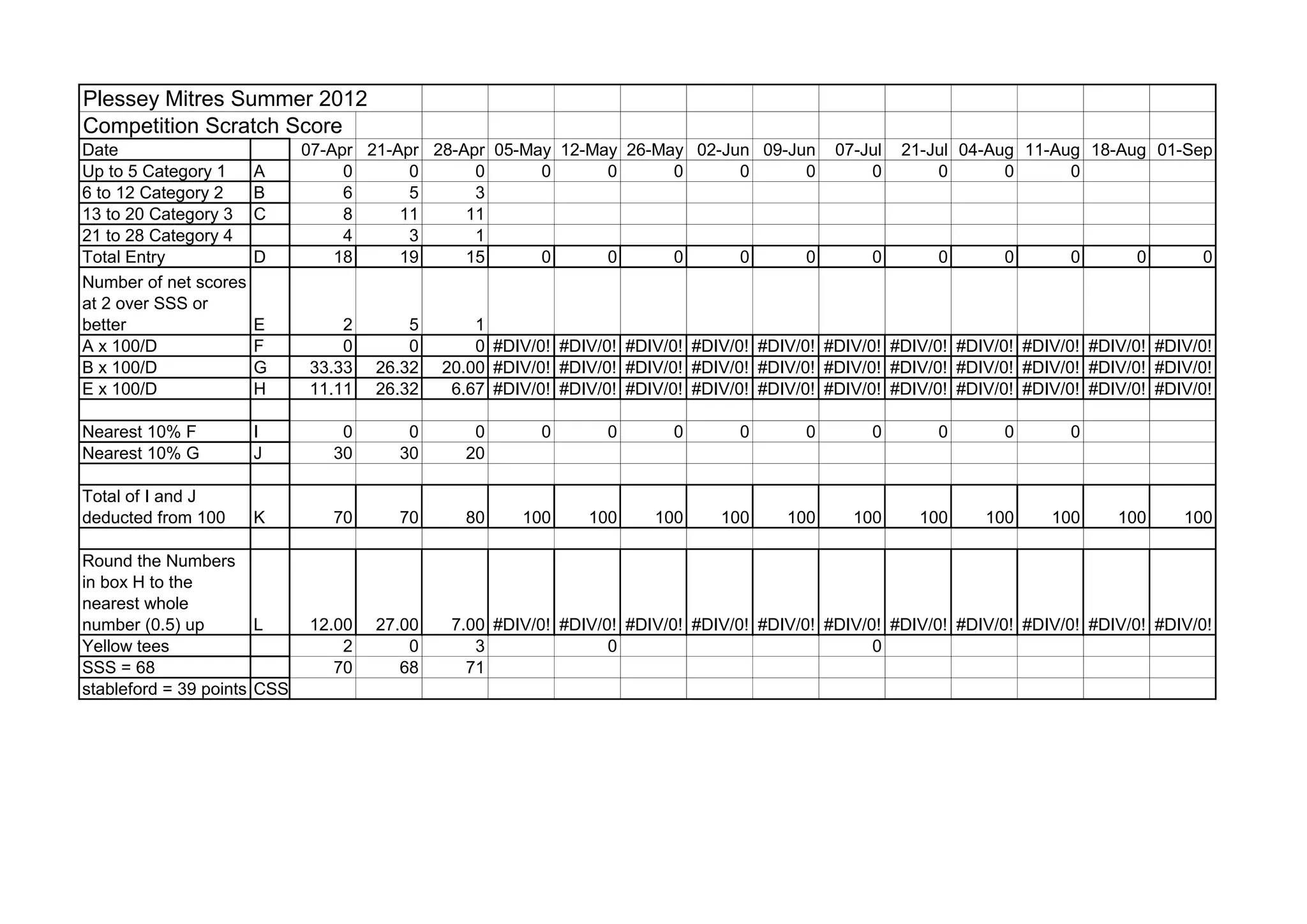 This document tracks golf competition scores over multiple dates from April to November. It records the number of entries in different scoring categories each date. The highest percentages of scores came from the 6-12 handicap category. The document also includes calculations of the percentages of entries that scored at or above the course rating each date, with percentages ranging from 6.67% to 27%.