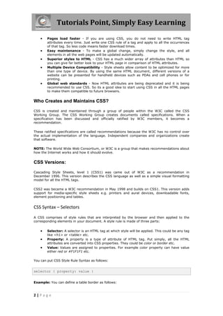 CSS is used to control the style and layout of web pages. It allows control over color, font, size, spacing, and various other visual effects without having to modify the HTML content. CSS rules are made of selectors that specify which elements the styles apply to, properties that define what is being styled, and values that are assigned to the properties. There are different ways to associate CSS with HTML including internal stylesheets, external stylesheets, inline styles, and CSS imports. CSS prioritizes rules based on how they are associated with the HTML.