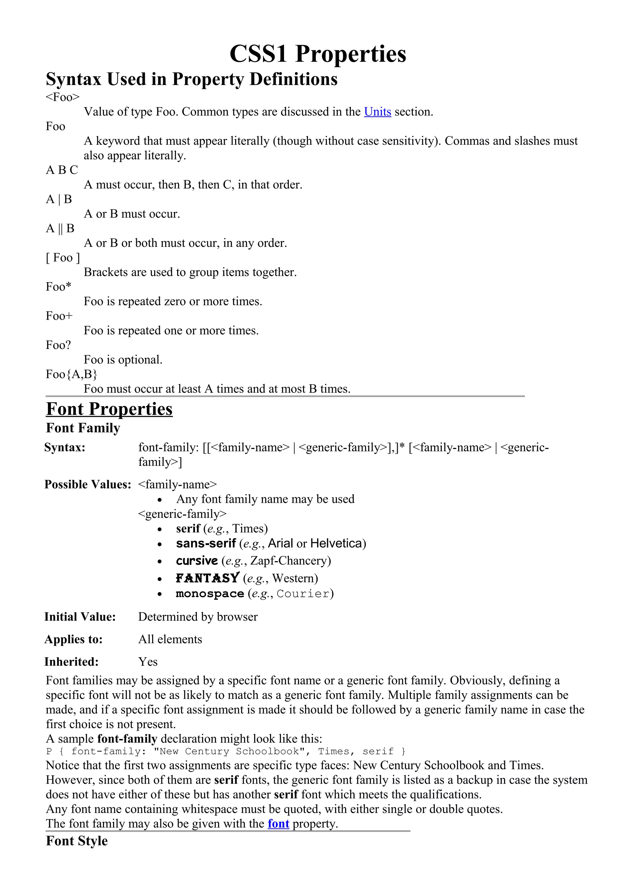 The document summarizes CSS1 properties for font, color, and background. It defines syntax, possible values, default values, applicable elements, and inheritance for properties like font-family, font-size, color, background-color, background-image, background-repeat, background-attachment, and background-position. Examples are given for setting values for each property.