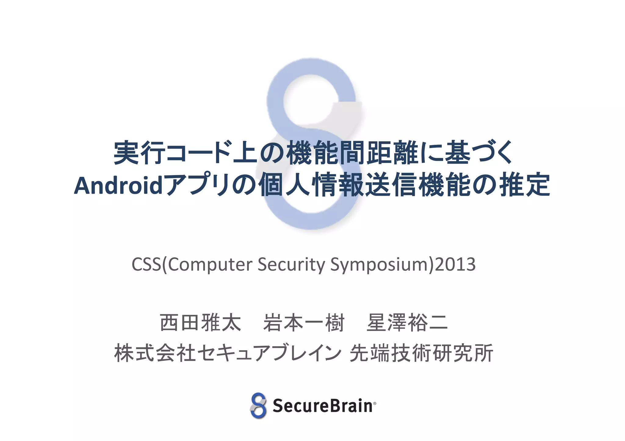 コンピュータセキュリティシンポジウム 2013で、株式会社セキュアブレイン西田が発表した資料です。「実行コード上の機能間距離に基づくAndroidアプリの個人情報送信機能の推定」