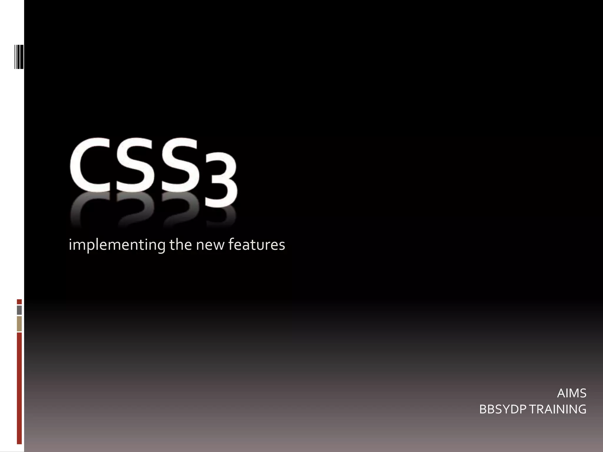 The document provides an overview of new features in CSS3, including new selectors, pseudo-elements, properties, and property groups. Some key points include: