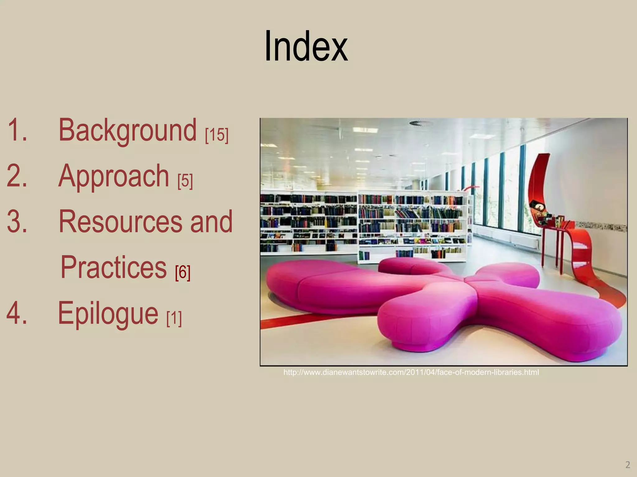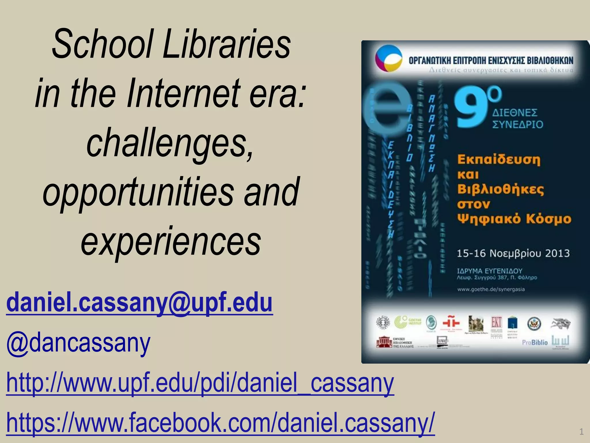 The document discusses the evolution of school libraries in the internet era, highlighting the challenges and opportunities they face in adapting to digital literacy practices. It emphasizes the shifting focus from traditional document management to learner-centered resource curation and the importance of understanding user needs. The conclusion presents five key aspects for modern libraries: mediation, curation, need analysis, local content, and attention to out-of-school learning.