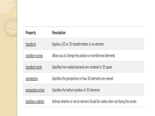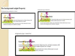 3. Different CSS properties are outlined for styling text, colors, backgrounds, borders, padding, margins and other element features. Examples are given for setting colors, images, sizes and other styles using CSS.