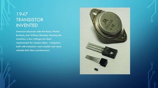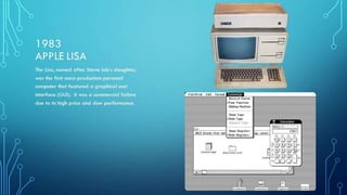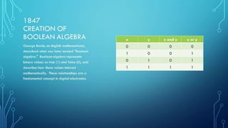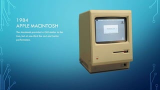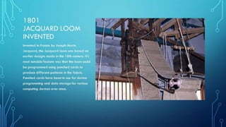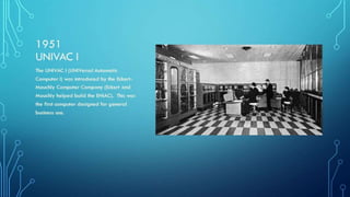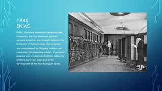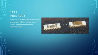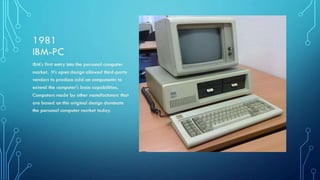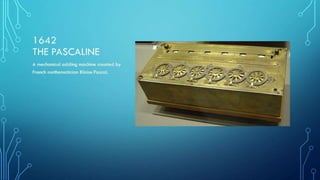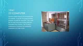This document provides an overview of computer architecture and programming design. It discusses early computing technologies including the abacus and Pascal's mechanical calculator. It also describes Charles Babbage's Difference Engine and Analytic Engine, and George Boole's work on Boolean algebra. The document outlines the Von Neumann architecture and its basic operations. It defines key components of computer systems like the processor, memory, I/O devices, and buses. It also discusses memory types, logic design, embedded systems, and software design methodology.