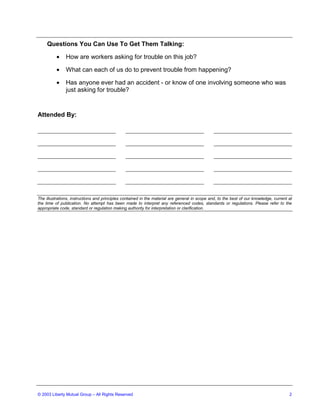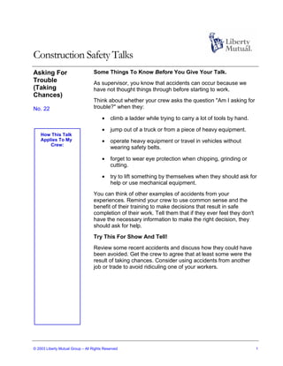 This construction safety talk discusses ways workers can avoid accidents by not "asking for trouble". It provides examples of risky behaviors like carrying too many tools up a ladder, jumping from equipment, or not wearing safety belts or eye protection for certain tasks. The talk encourages workers to think through their actions and get help if they are unsure how to safely complete a job. It also suggests reviewing past accidents to discuss how safety could have been improved to prevent injuries. The goal is for the crew to agree that some accidents result from taking unnecessary chances and to think proactively about safety.