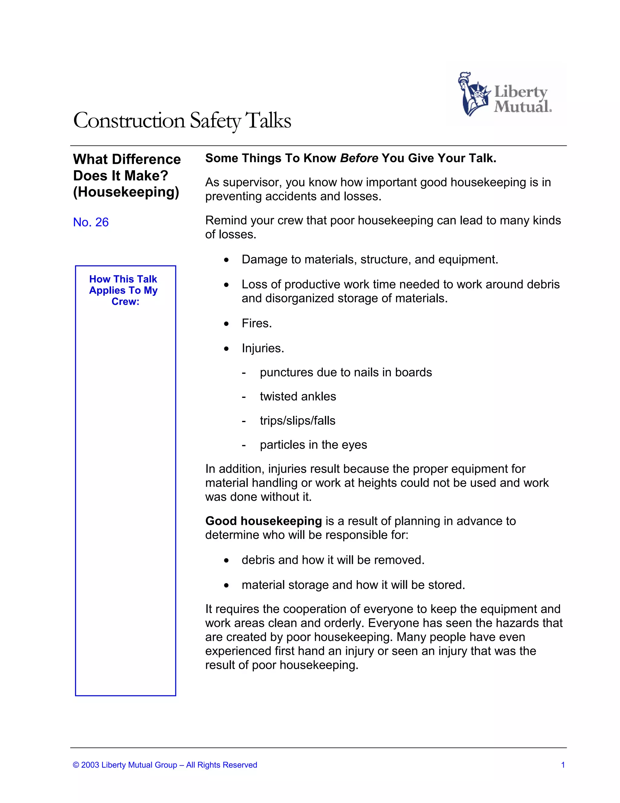This document provides a safety talk about the importance of good housekeeping on construction sites. It notes that poor housekeeping can lead to damage of materials and equipment, loss of productive work time, fires, and injuries such as punctures, twisted ankles, trips and falls, and particles in eyes. Good housekeeping requires planning debris removal and material storage responsibilities. It encourages supervisors to point out an area needing improvement and ask crew for suggestions to enhance housekeeping. Questions are provided to facilitate discussion on current housekeeping, debris removal, and accidents caused by poor housekeeping.