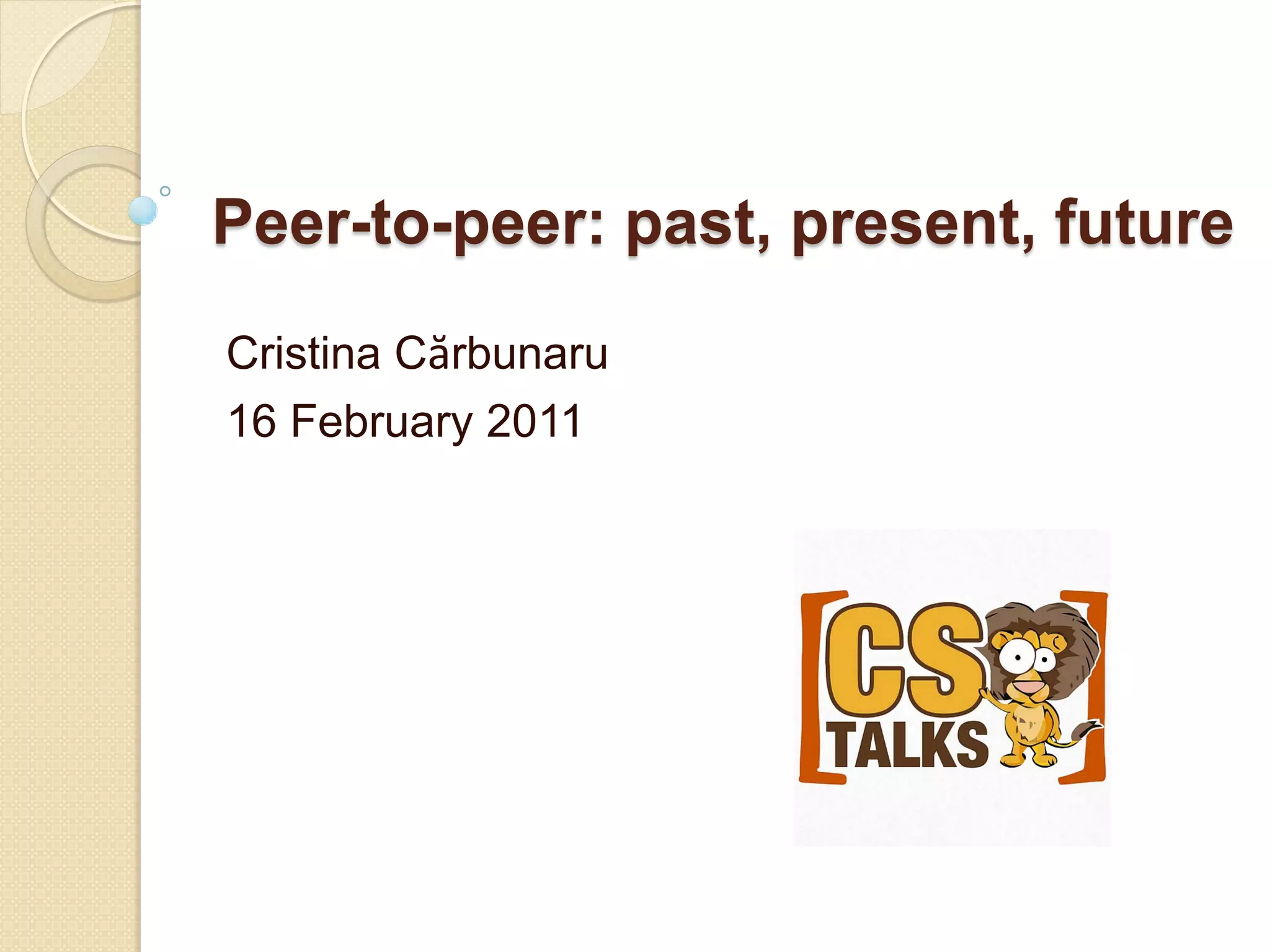This document discusses the past, present, and future of peer-to-peer (P2P) networks. It describes how P2P networks emerged to help alleviate load on servers and make use of the interconnectivity between nodes. Popular early P2P file sharing applications like Napster, Gnutella, and BitTorrent are discussed. While P2P file sharing declined due to legal issues, P2P protocols now see growing use for media streaming, communication, and within data centers. The document predicts P2P will continue evolving with technologies like IPv6 and play an increasing role in areas like social networks and peer production.