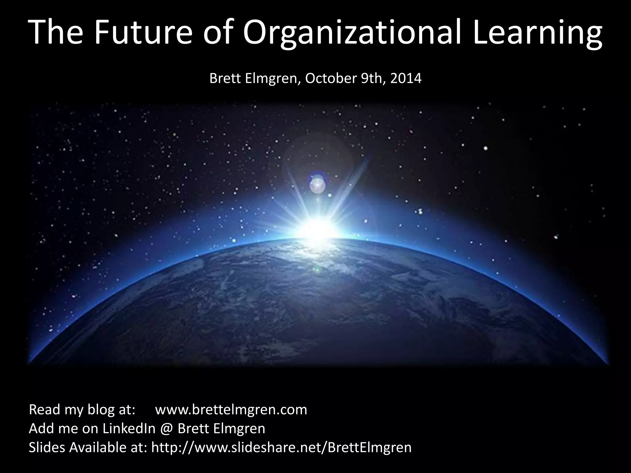 The document discusses the evolution and future of organizational learning. It notes that learning has shifted from formal classroom-based training to informal social and blended approaches, driven by changing demographics, the rise of social media, and new work models. The future of learning is predicted to involve greater gamification, flipped classrooms, and an "access, recommend, curate" or ARC model to support continuous, collaborative, and connected learning through both formal and informal approaches.