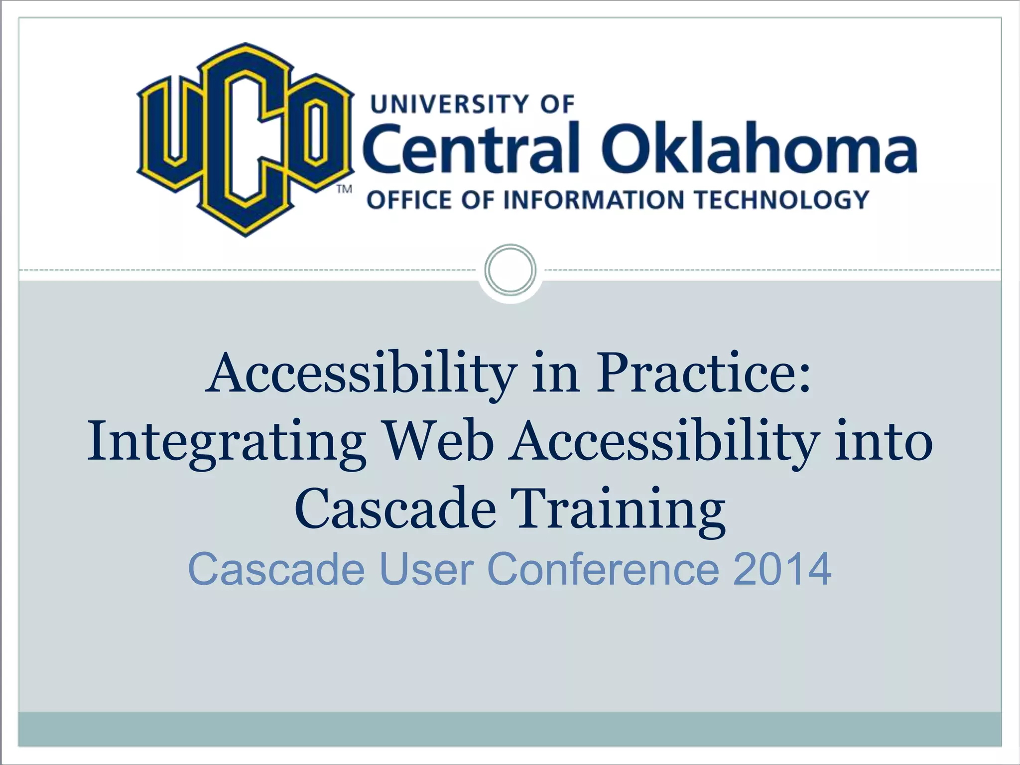 The document summarizes a presentation about integrating web accessibility into training at Cascade User Conference 2014. It discusses administrator options in the content management system to enable accessibility, common accessibility myths versus realities, best practices for alternative text, headings, tables, and more. The presenter emphasizes the importance of accessibility and shares resources to help make content more inclusive.