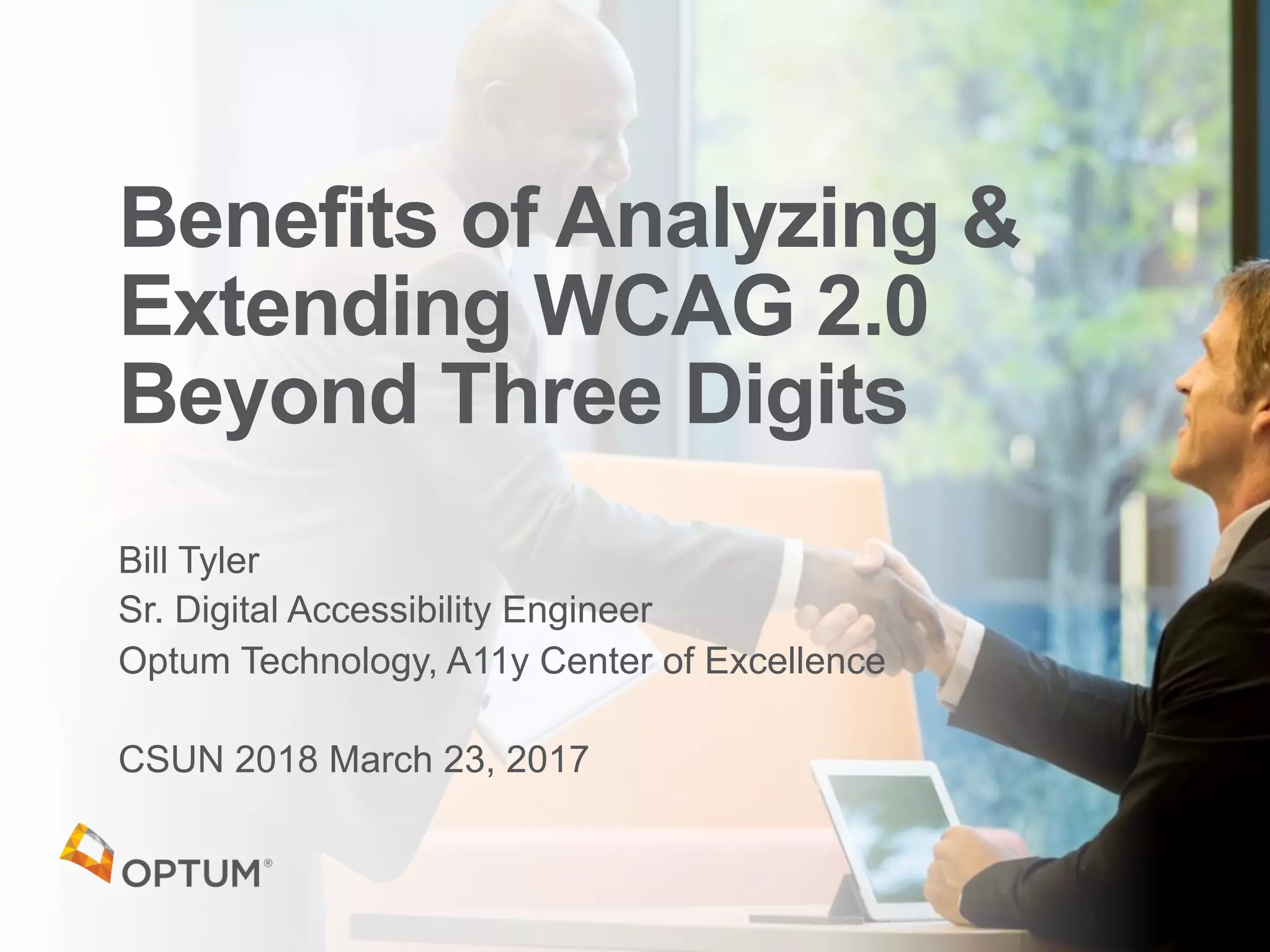 Bill Tyler, a digital accessibility engineer, presents an analysis of WCAG 2.0 and its implications for web accessibility, drawn from over four years of research. The analysis identifies sub-cases across success criteria, innovation in indexing methods, and extends WCAG structures to enhance clarity and implementation. The presentation highlights the challenges in current criteria, the introduction of meta-rules, and the necessity for a more flexible approach to succeed in meeting accessibility standards.