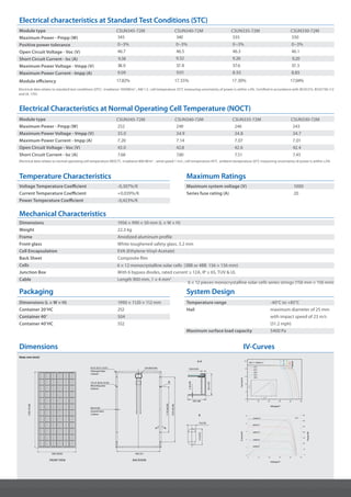 2) The document provides specifications for CSUN's line of mono-crystalline solar modules, including power output, dimensions, certifications, and performance warranties of 25 years for linear power output and 10 years for materials and workmanship.
