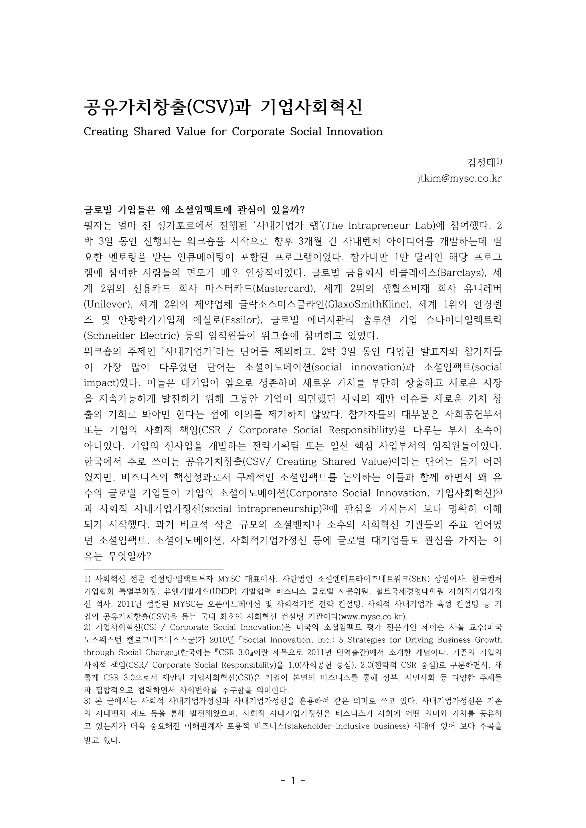 2) 기업사회혁신(CSI / Corporate Social Innovation)은 미국의 소셜임팩트 평가 전문가인 제이슨 사울 교수(미국
