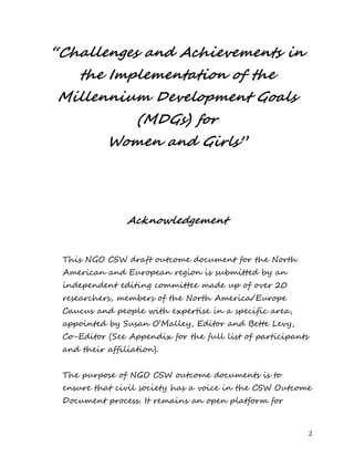 This document summarizes challenges and achievements related to implementing the Millennium Development Goals (MDGs) in North America and Europe based on an analysis by 20 researchers. It finds that while progress has been made in some areas like education, poverty rates remain high particularly for women, minorities, indigenous peoples, and single mothers. Inequality is growing between rich and poor in countries like the US and Canada. Women still face barriers in fields like STEM and continue to earn less than men. It calls for actions like increasing the minimum wage, ensuring universal early childhood education, improving schools in low-income areas, and closing the gender pay gap.