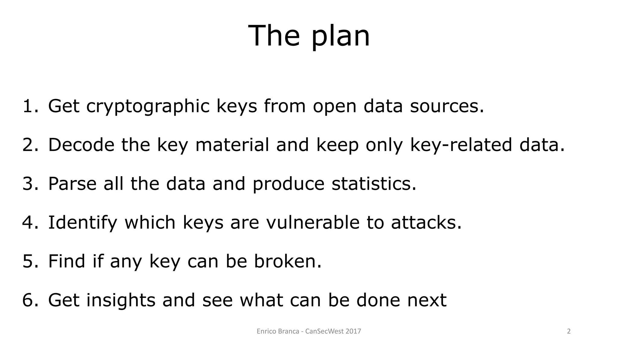 The document discusses analyzing over 73 million encryption certificates to test their security. It finds that over 25 million certificates share the same public key, over 2.5 million share the same modulus, and over 750,000 share divisors, indicating weak key generation. It also finds some certificates with invalid exponents, moduli divisible by small primes, and a few with an exponent of 1, all of which make the keys insecure. The analysis shows many keys assumed to be secure may actually be vulnerable to attacks due to flaws in key generation.