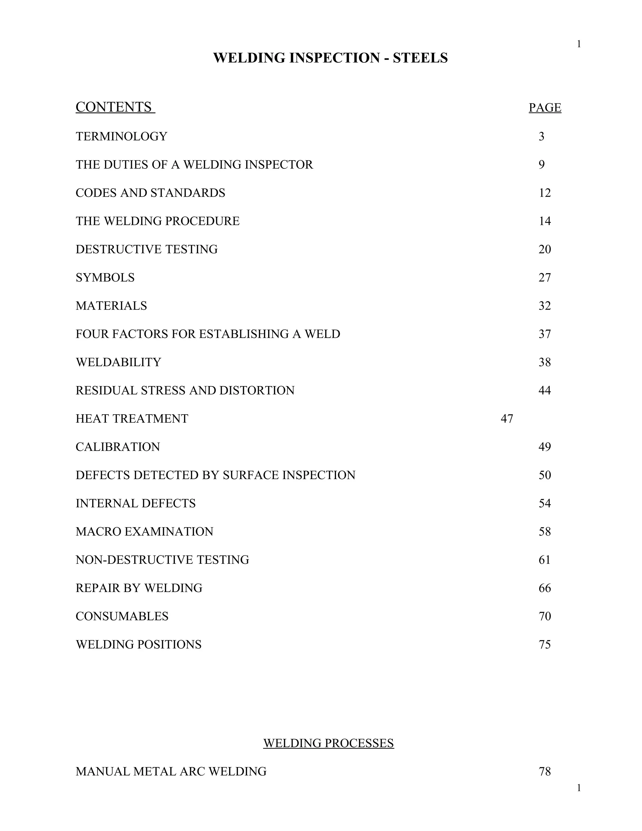 This document provides an overview of welding inspection for steels. It defines key terminology related to welding and discusses the duties of a welding inspector, including visual inspection, use of aids, and following inspection codes and standards. It also covers welding procedures, essential variables, joint preparation, weld sizes, defects, testing methods, and more. The goal is to provide comprehensive guidance on properly inspecting welded steel structures.
