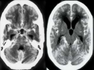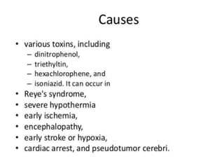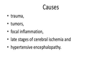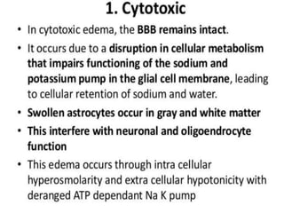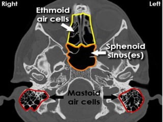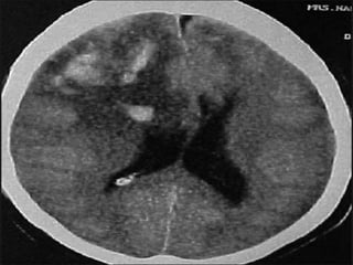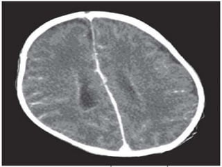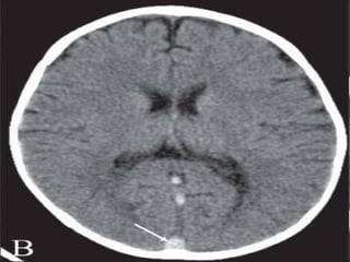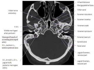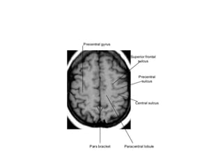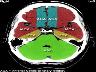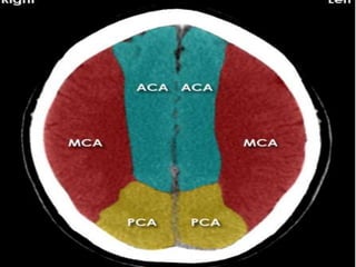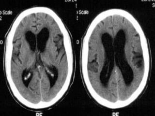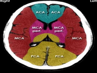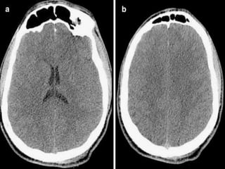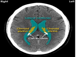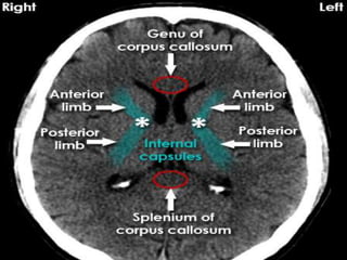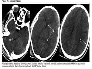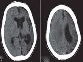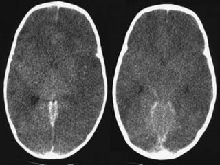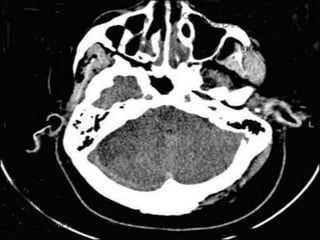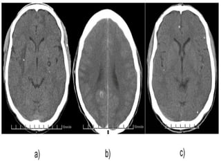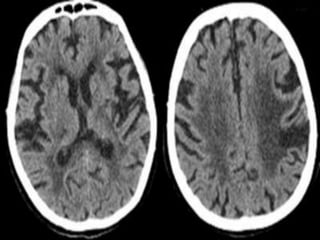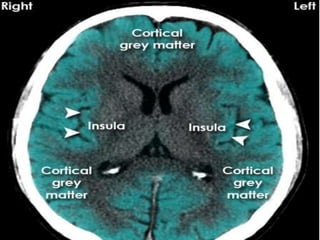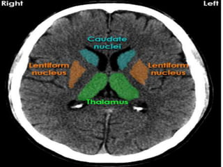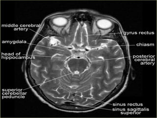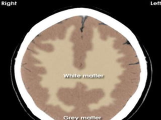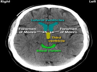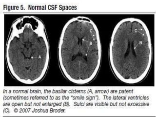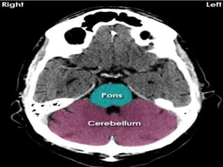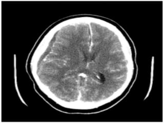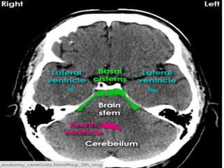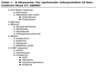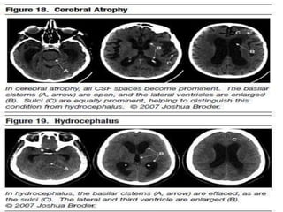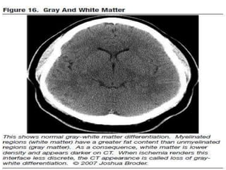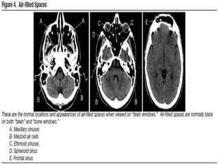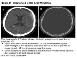The document provides information about CT brain imaging including terminology used, differences between CT and MRI, how a CT scan works, tissue densities visualized on CT, common anatomical structures seen on brain CT, approaches to interpreting a CT brain scan, and various pathological conditions that can be identified on CT including trauma, vascular insults, infections, tumors and other disorders. Key points covered include how CT provides clear bone images while MRI better depicts soft tissue contrast, how CT reconstruction works to create cross-sectional images, and examples of some common abnormalities that manifest as hyperdense or hypodense lesions on CT scans.