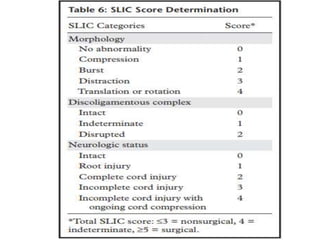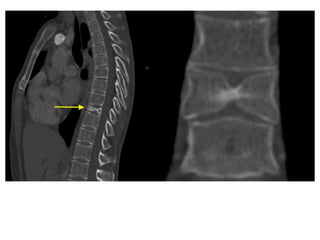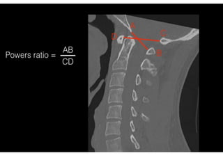This document provides a detailed overview of cervical spine anatomy and common cervical spine injuries seen on CT imaging. It begins with a description of cervical spine anatomy including the typical vertebrae from C3-C6 and the atypical C1 and C2 vertebrae. It then discusses common cervical spine injuries such as fractures of C1-C2, hangman's fractures of C2, and odontoid fractures. Classification systems for these injuries are provided along with example CT images. The document concludes with a brief discussion of subaxial cervical spine injuries.