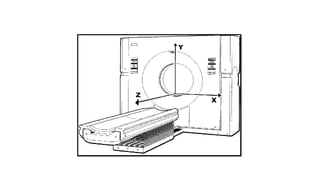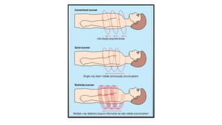 CT or computed tomography is a medical imaging technique that uses x-rays and computer processing to create cross-sectional images of the body. The first CT scan took 9 days to produce a single image in 1971, while modern CT scanners can produce multiple slices in under 1 second. A CT scan uses an x-ray tube and detectors mounted on a rotating gantry to measure the attenuation of x-rays through tissue from different angles, and computers process this data to reconstruct cross-sectional images. CT has advanced from early generations with single detectors to current multi-detector arrays that allow faster whole-organ or whole-body imaging.