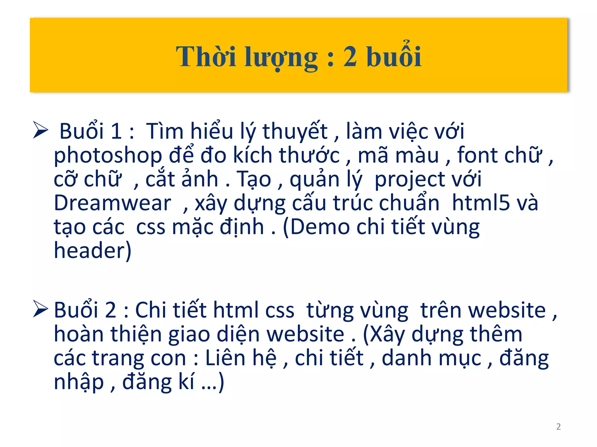 Khóa học cắt HTML CSS từ PSD kéo dài 2 buổi, tập trung vào lý thuyết và thực hành với Photoshop và Dreamweaver để xây dựng website chuẩn HTML5. Học viên sẽ chuẩn bị file PSD, cài đặt phần mềm cần thiết và học cách phân tích bố cục, cắt ảnh, và quản lý project. Cuối cùng, khóa học sẽ hướng dẫn hoàn thiện giao diện cho trang web và các trang con đi kèm.