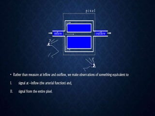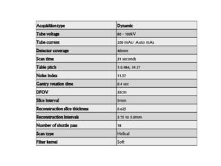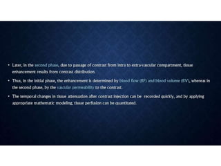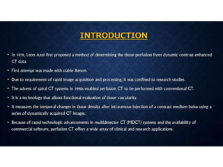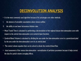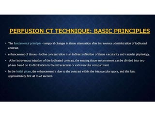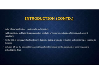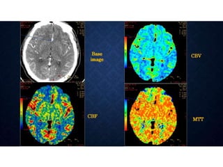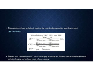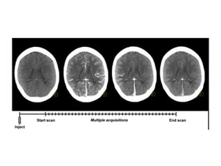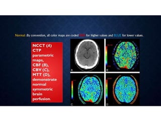 CT perfusion (CTP) provides important hemodynamic information about cerebral blood flow, blood volume, and mean transit time that complements CT angiography in the evaluation of acute stroke. CTP can help characterize acute ischemic stroke by identifying critically ischemic tissue in the stroke "core" and potentially salvageable tissue in the "penumbra", guiding treatment decisions about thrombolysis within time windows. A typical CTP exam involves an initial non-contrast CT followed by dynamic contrast-enhanced imaging over 40-60 seconds to generate perfusion maps and quantify key parameters.