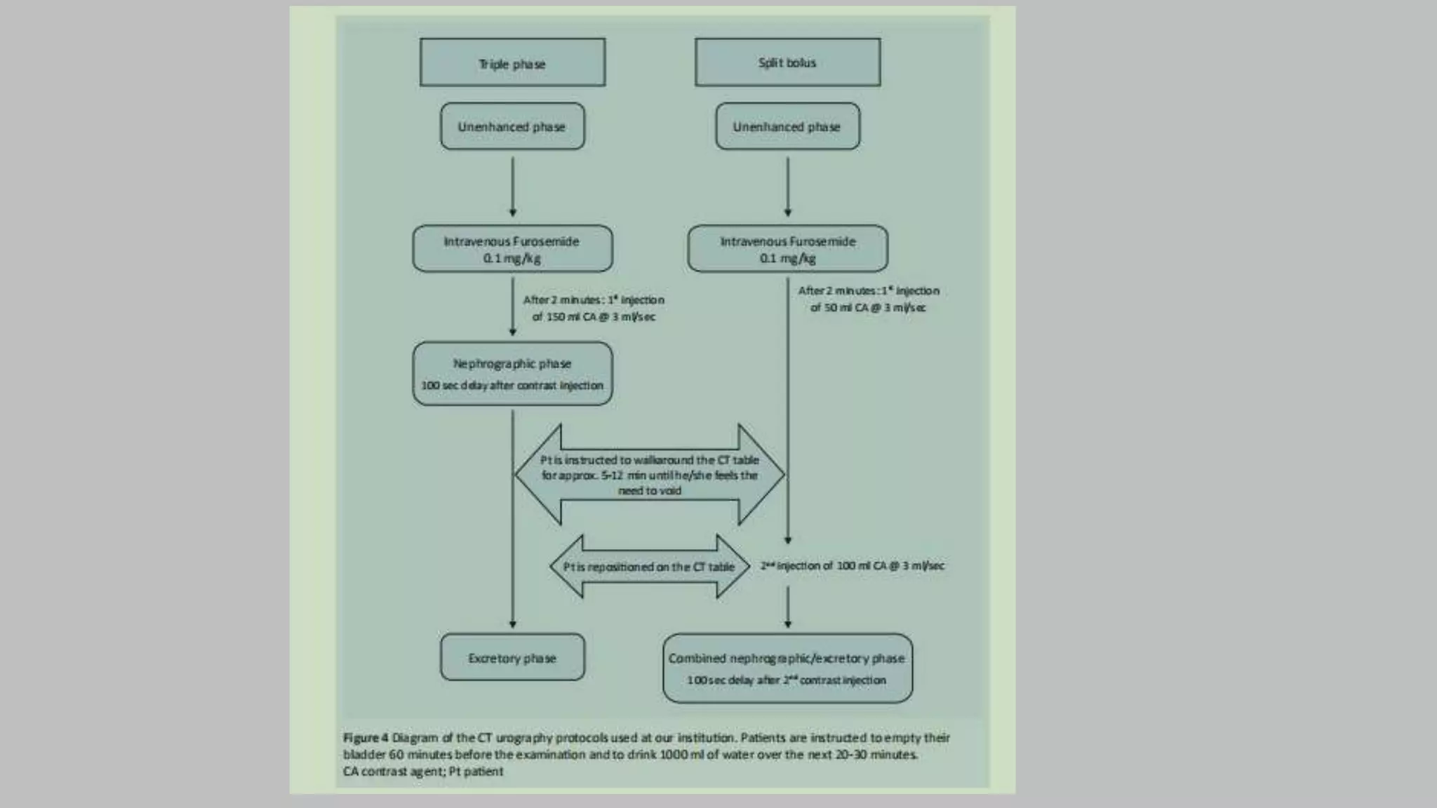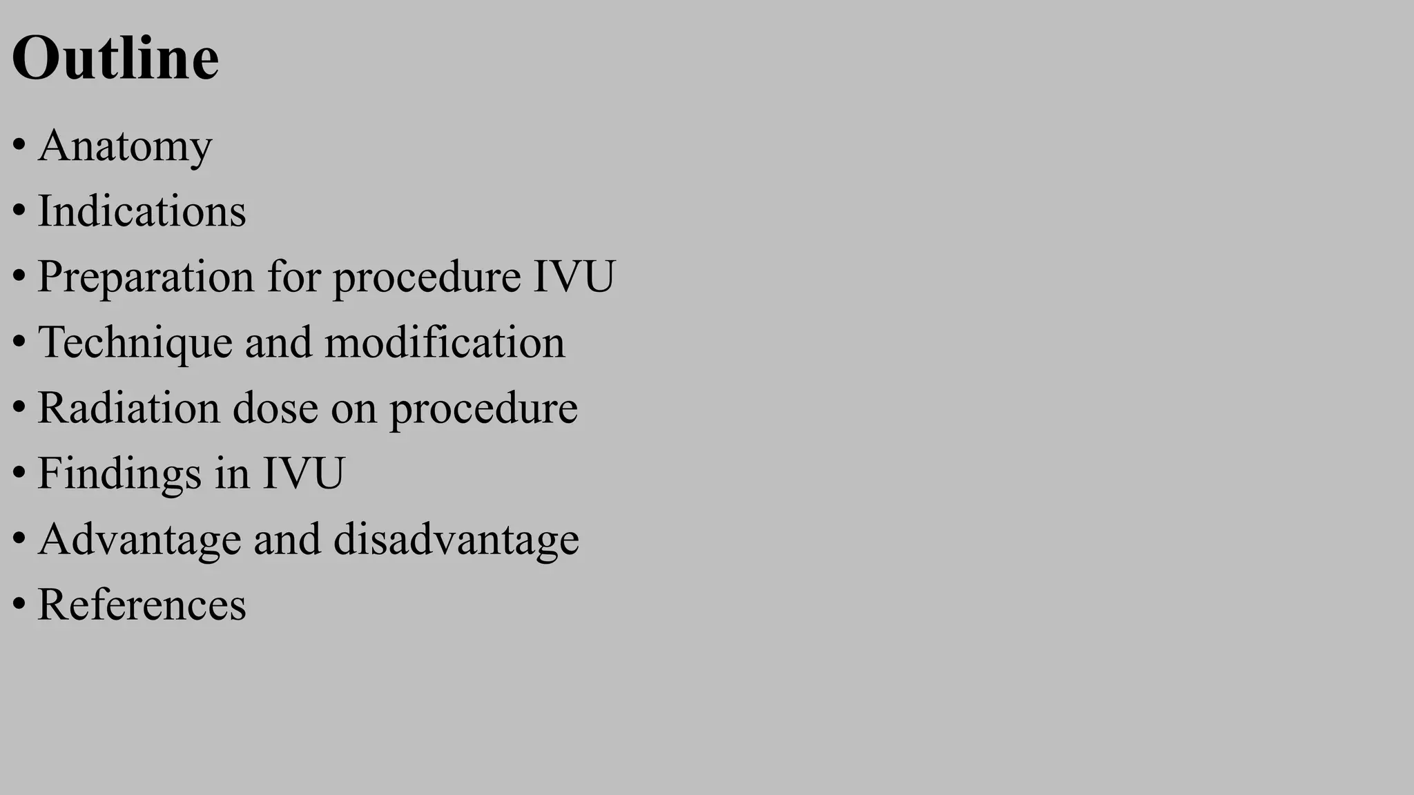 This document outlines a CT protocol for intravenous urogram (IVU), detailing the anatomy, indications, preparation, and imaging techniques involved in the procedure. It emphasizes the importance of multi-phase CT imaging, the contrast media used, and the methods to minimize radiation exposure. Additionally, it discusses various renal structures, potential complications, and the advantages of advanced imaging techniques such as dual-energy CT.