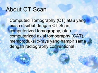 CT scan atau tomografi komputer merupakan teknik pencitraan medis yang menghasilkan gambar potongan silang dari tubuh menggunakan sinar X. Teknik ini mampu melihat perbedaan jaringan dengan baik dan sering digunakan untuk mendeteksi berbagai kondisi seperti tumor, pendarahan, dan cedera di kepala, dada, abdomen, dan bagian tubuh lainnya. Prosedur CT scan melibatkan pemberian zat kontrast intravena dan meminta
