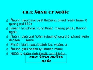 Tài liệu này trình bày về ứng dụng của hình ảnh CT trong chẩn đoán bệnh lý ngực, bao gồm đánh giá các bệnh lý phổi, trung thất, và các giai đoạn ung thư. Nó đề xuất các kỹ thuật chẩn đoán hình ảnh chi tiết và những yếu tố cần lưu ý khi phân biệt giữa các loại bệnh lý khác nhau. Ngoài ra, tài liệu cũng đề cập đến sự phân loại và tác động của các bệnh lý mà hình ảnh CT có thể phát hiện.