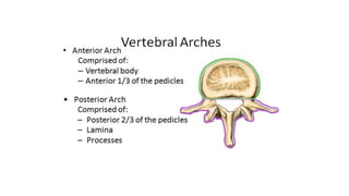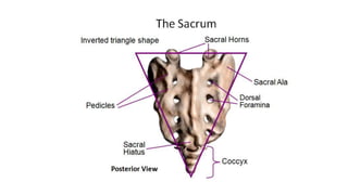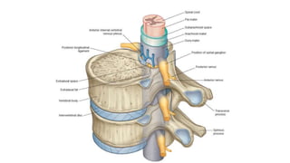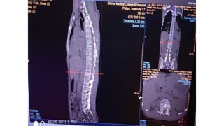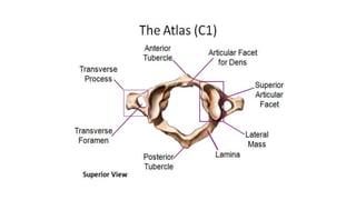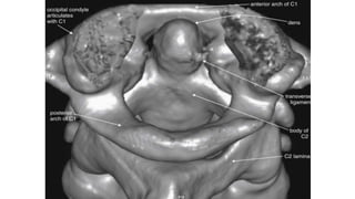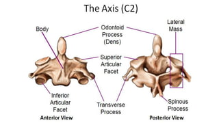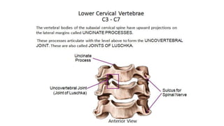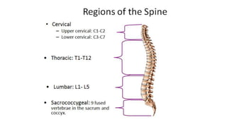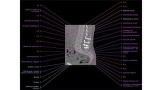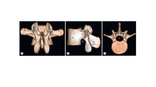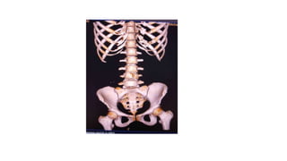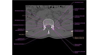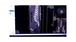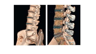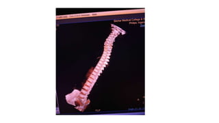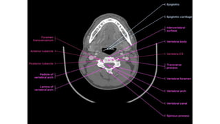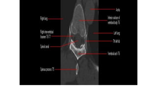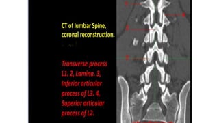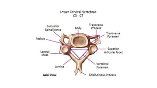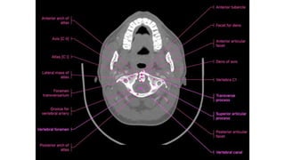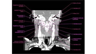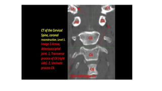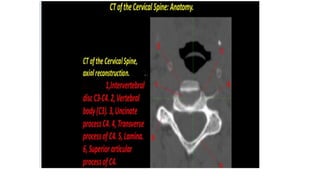 This document provides an overview of CT imaging of the cervical spine. It discusses the anatomy of the cervical spine including the typical vertebrae and curves. It describes the techniques used in CT imaging, including positioning the patient and acquiring scans to allow reconstruction in multiple planes. CT is useful for trauma evaluation and detecting fractures. Example images show normal anatomy on CT as well as a burst fracture. The document also provides some basics on lumbar spine and pelvis anatomy.