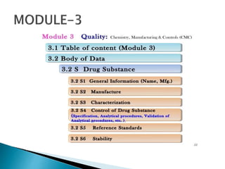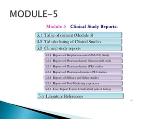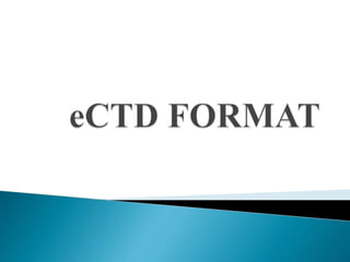The document outlines the Common Technical Document (CTD) and its electronic counterpart, the Electronic Common Technical Document (eCTD), emphasizing their roles in harmonizing pharmaceutical registration processes internationally. It details the structure of the CTD, which consists of five modules covering administrative information, summaries, quality assessments, and study reports, enabling efficient submission and review of medicines. The eCTD aims to enhance submission accuracy and decrease costs while facilitating better communication and information management in regulatory processes.