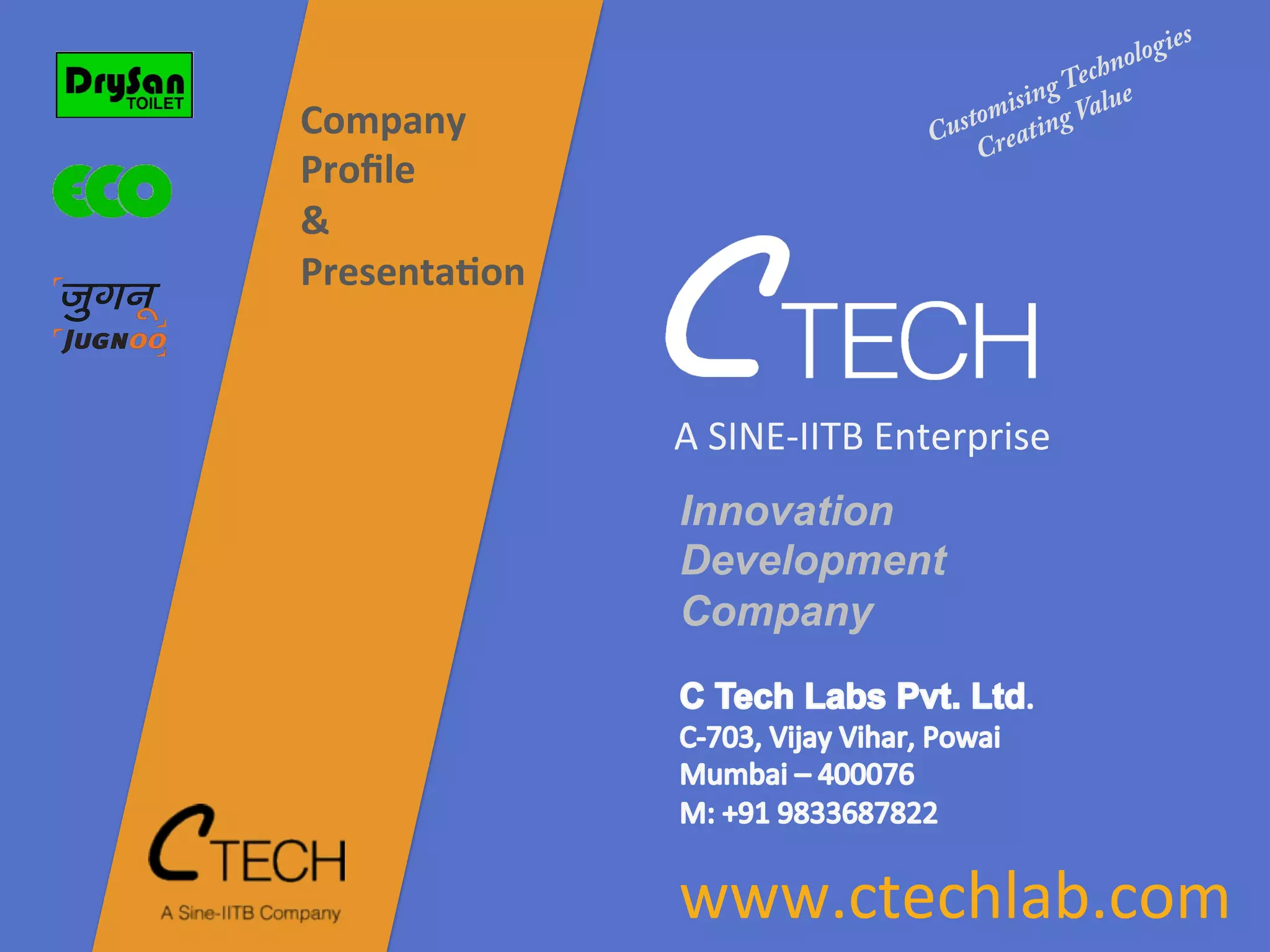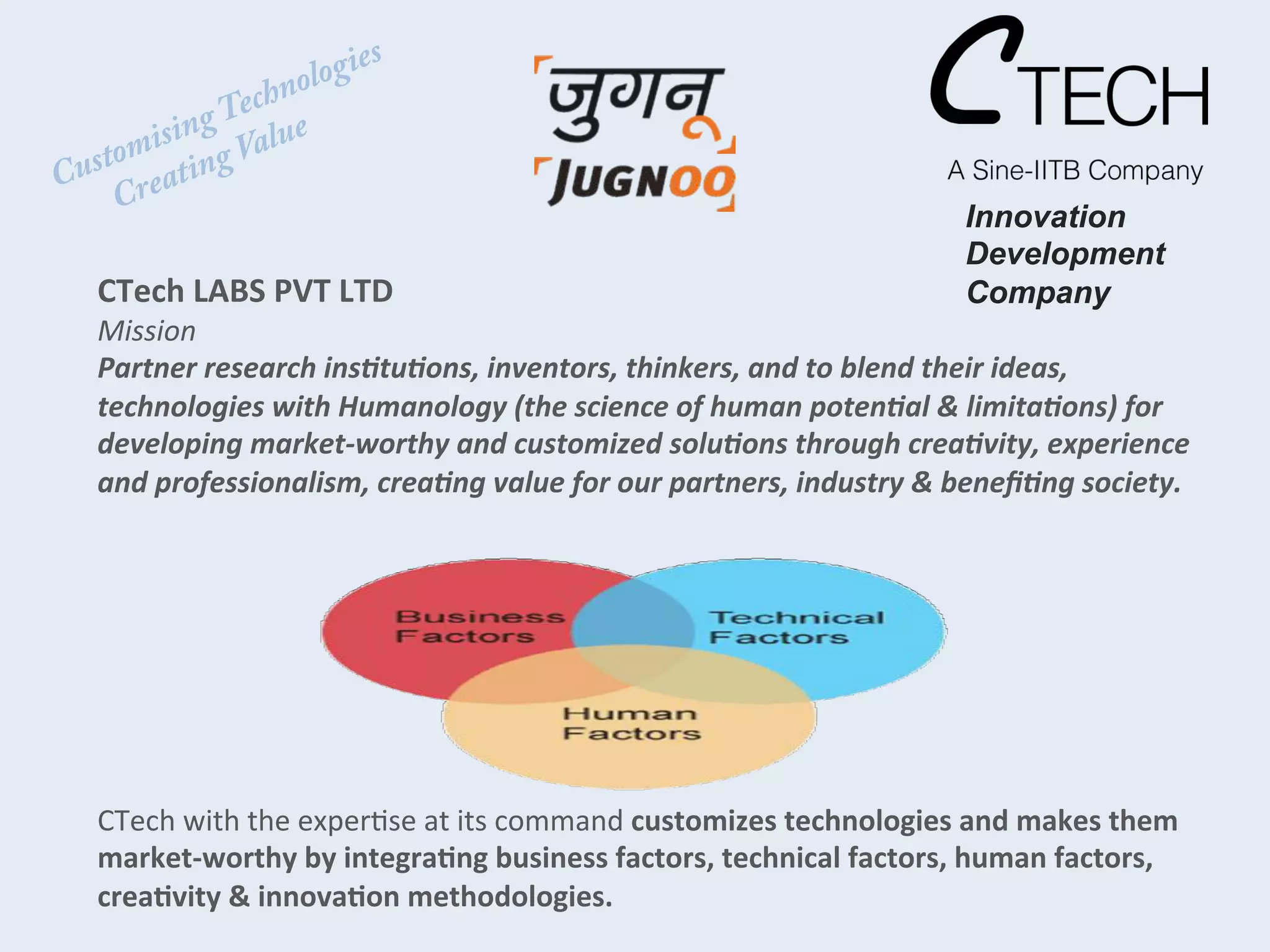 This document provides information on CTech Labs Pvt Ltd, an innovation and product development company. It outlines CTech's mission to partner with research institutions and inventors to develop market-worthy, customized solutions by integrating technologies with human factors. It then describes some of CTech's current and past partnerships with organizations like DRDO, Tata Steel, and IIT Bombay to develop products in areas like communications encryption, mining equipment, medical devices, and an environmental monitoring system. The document promotes CTech's services in areas like product design, business consulting, and new product development.