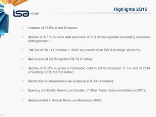 CTEEP reported its financial results for the second quarter of 2015, with the following highlights: