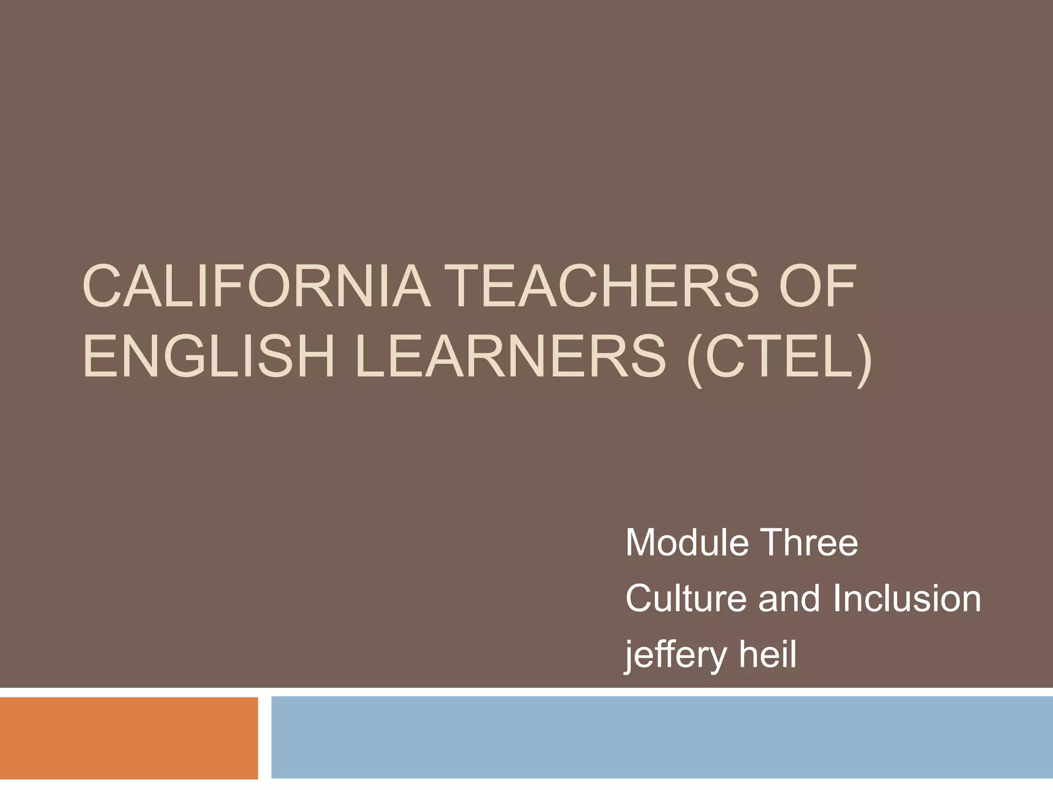 This document provides information about Module 3 of the California Teachers of English Learners (CTEL) program, which focuses on culture and inclusion. It discusses key vocabulary, concepts, and instructional strategies related to understanding the diverse cultural and linguistic backgrounds of English Learner students in California. Some key points include: