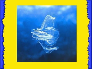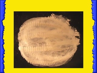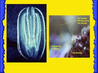 Ctenophores are a phylum of marine invertebrates that are major predators of zooplankton and fish larvae. They use rows of fused cilia and adhesive cells on their tentacles to capture prey. While similar to cnidarians, ctenophores differ in having genuine smooth muscle, multiciliated cells, hermaphroditism, and gastrulation through epiboly or invagination rather than cnidarian processes.