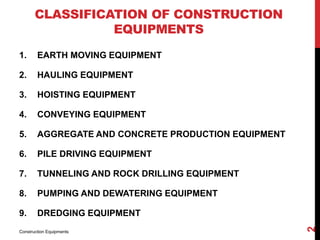 This document provides an overview of various types of construction equipment, including their classification and uses. It discusses earth moving equipment such as power shovels, backhoes, draglines, and clam shells. It also covers compacting equipment like smooth wheel rollers, sheep-foot rollers, and pneumatic tired rollers. Additional equipment covered include pile driving rigs and their uses in transferring surface loads into the ground. The document aims to classify and explain the purpose and functioning of many important pieces of machinery used in construction projects.