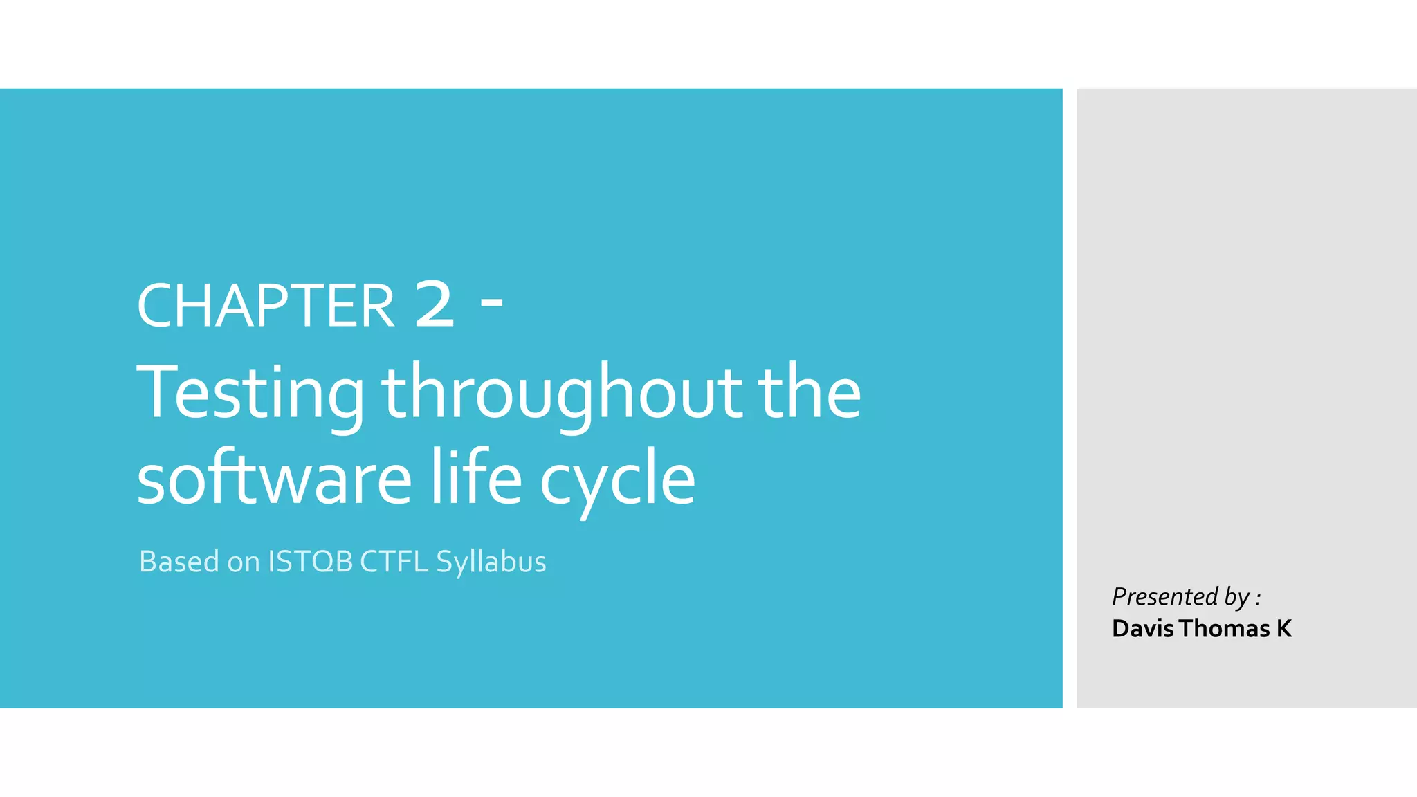 The document discusses software testing throughout the development life cycle. It covers various software development models like waterfall, V-model, incremental, RAD, agile and prototype. It describes different test levels like unit testing, integration testing, system testing and acceptance testing. It also discusses various test types like functional testing, non-functional testing, structural testing and change-related testing. Finally, it provides details about integration testing approaches, acceptance testing types and examples of non-functional testing.
