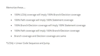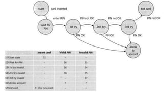 This document discusses various static and dynamic testing techniques. It explains that static testing is done manually without executing code, such as reviews and inspections. Dynamic testing requires executing the code using techniques like unit testing. Black box techniques like equivalence partitioning, boundary value analysis, decision tables, and state transition testing are covered, along with an example for each. White box techniques focus on internal code structure and test coverage metrics. The document provides details on different testing techniques for testers to design effective test cases.