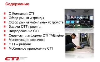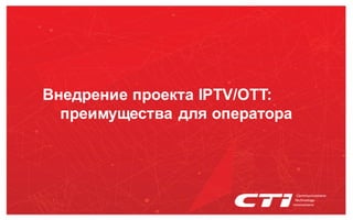 Документ описывает проект внедрения IPTV/OTT, охватывая преимущества для операторов связи и анализируя рынок, включая ключевые тенденции и рост абонентской базы. Компания CTI выделяется как ведущий игрок на рынке, предлагая решения для интерактивного телевидения и поддерживая гибридные платформы. Основные задачи проекта направлены на повышение пользовательского комфорта, увеличение лояльности и поддержание конкурентоспособности на быстро меняющемся рынке видеоконтента.