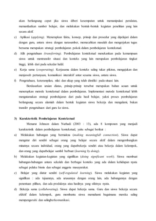 Pendekatan Contextual Teaching and Learning (CTL) adalah metode pembelajaran yang mengaitkan materi ajar dengan situasi nyata yang dihadapi siswa, melibatkan tujuh komponen penting dan sejumlah prinsip dasar seperti relevansi, pengalaman langsung, dan kerja sama. Pembelajaran CTL bertujuan untuk menjadikan siswa aktif dan mampu menghubungkan pengetahuan dengan aplikasi praktis dalam kehidupan sehari-hari. Keuntungan dari pendekatan ini adalah pembelajaran yang lebih bermakna dan produktif, memfasilitasi siswa untuk menemukan pengetahuannya sendiri melalui pengalaman nyata.
