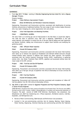 The document is a 4-page curriculum vitae for C. Thirumoorthy that outlines his 24+ years of experience in equipment design, commissioning, operation, and troubleshooting of oil, gas, petrochemical and fertilizer plants. It details his current role as Deputy Manager-Process and highlights his skills in areas like equipment design, commissioning activities, safety focus, and plant optimization. It also lists his educational background and work history at various companies in India, Egypt, and Saudi Arabia working on projects like refineries, gas processing plants, and ammonia/urea plants.