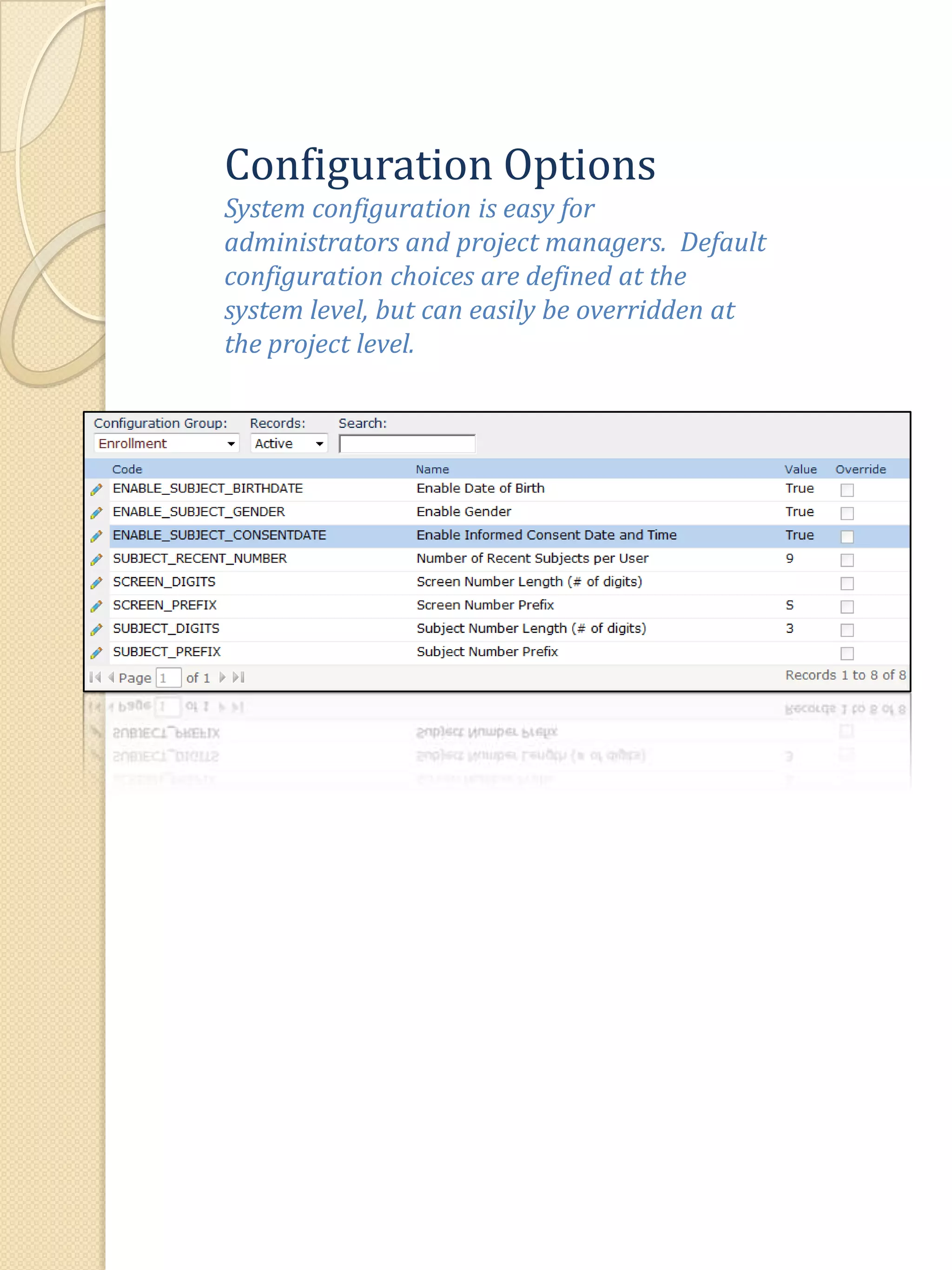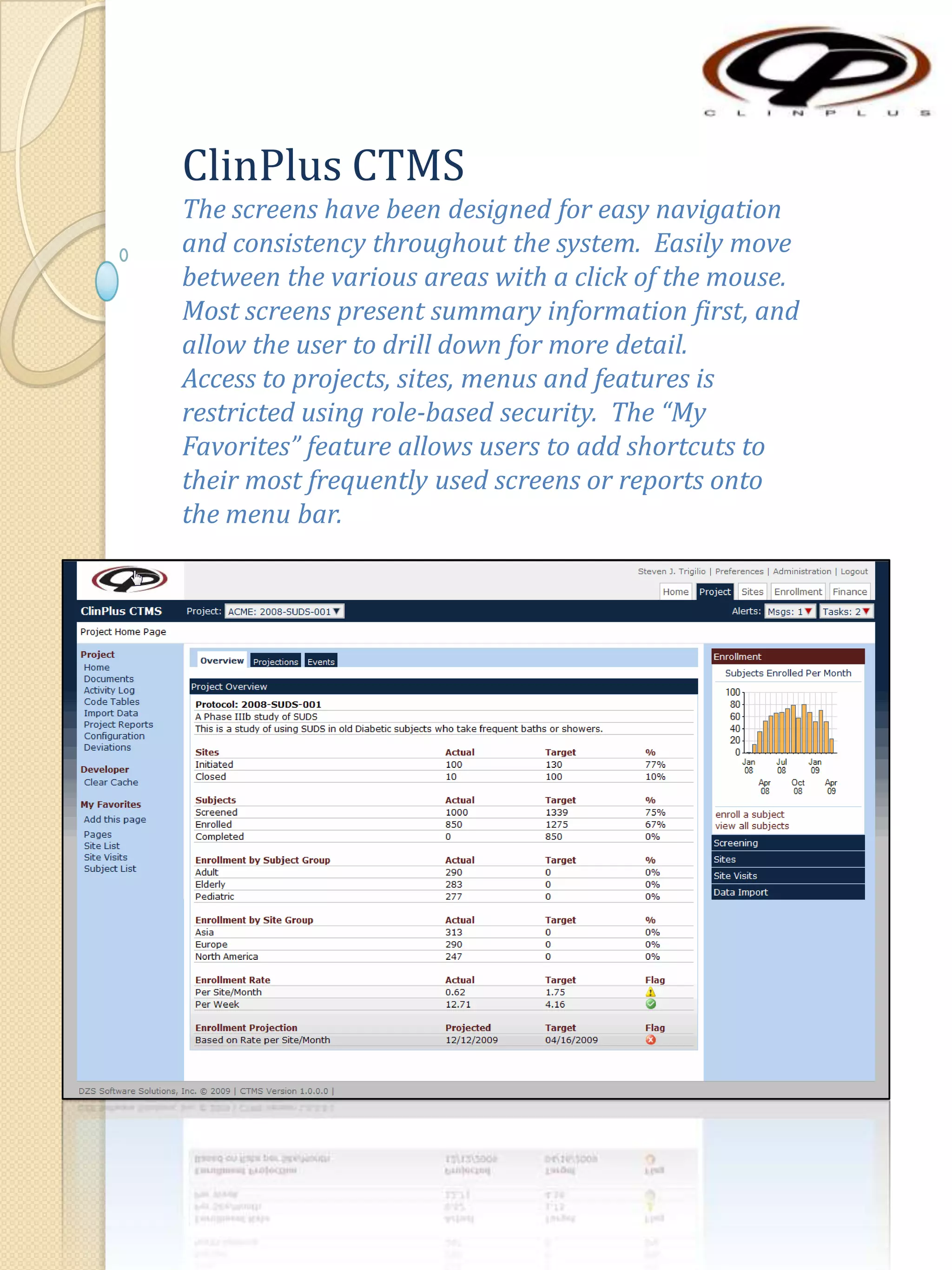 The document describes various features of the ClinPlus CTMS clinical trial management system. It allows for easy navigation between screens that present summary information first with the ability to drill down for details. Role-based security restricts access to projects, sites, menus and features. Configuration can be defined at the system level but overridden at the project level. A combination of manual and automated tasks are used to ensure project steps are completed on time. Project messages, overviews, projections, events, charts, site events, visits, documents, blogs, payments to investigators, and financial overviews are described as key features to manage clinical research projects and metrics.