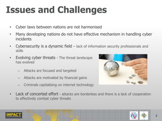 The document discusses strengthening international cooperation to address evolving cyber threats. It introduces IMPACT, an international cybersecurity alliance, and its role in operationalizing initiatives through the ITU's Global Cybersecurity Agenda. IMPACT brings together governments, industry, and academia to facilitate capacity building, technical assistance, training, research, and policy development efforts across 191 countries.