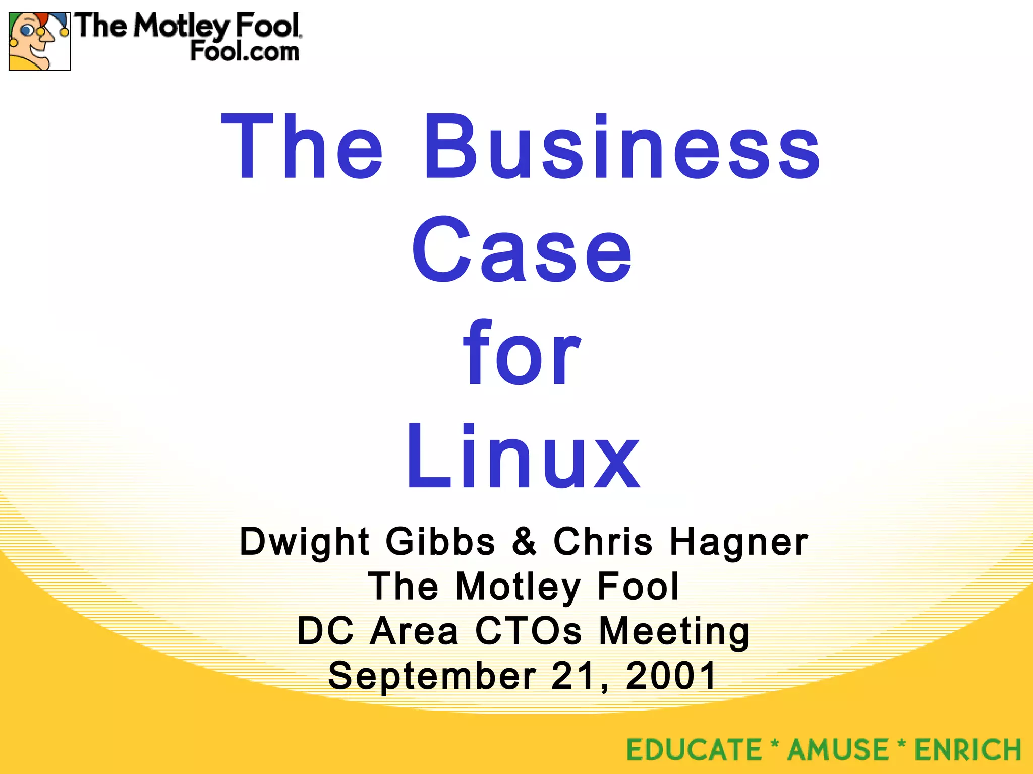 This document discusses the business case for using Linux over other operating systems. It outlines some of the technical cost buckets associated with operating systems, including services, hardware, software, and human resources ("meatware"). For each category, it notes both advantages and disadvantages of Linux compared to other options like Solaris, Unix, AIX, and Windows. It then shares details about The Motley Fool's experience migrating some of their systems from Windows to a Linux environment. The document concludes that Linux is a robust, stable and inexpensive option that should be considered for any server application depending on an organization's specific needs and software requirements.