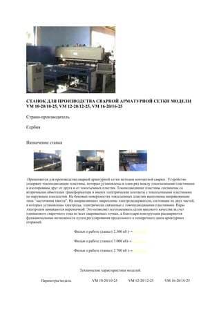 Документ описывает станок для производства сварной арматурной сетки различных моделей, производимых в Сербии, включая его назначение и конструкцию. Он оснащен токоподводящими пластинами, электрододержателями и возможностями регулировки для обеспечения высококачественного производства. Также упоминаются технические характеристики, производительность и дополнительные компоненты, которые могут быть изменены в зависимости от потребностей клиента.