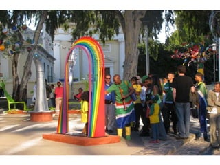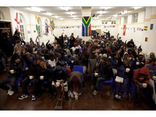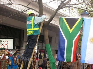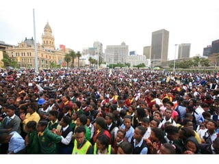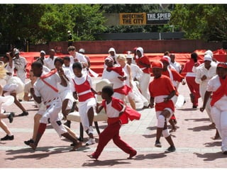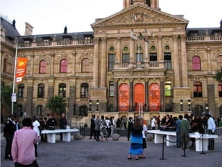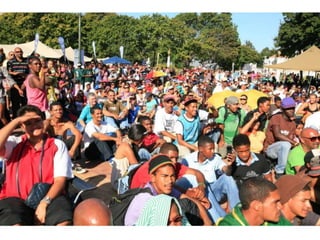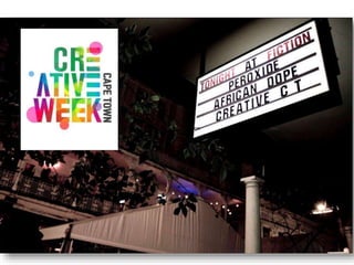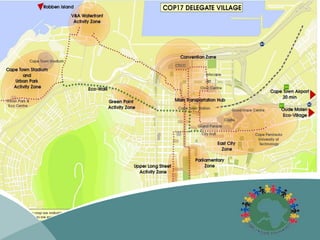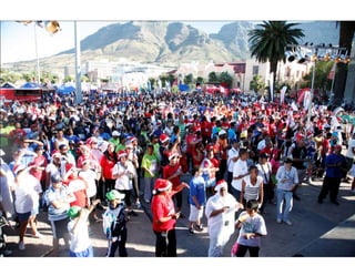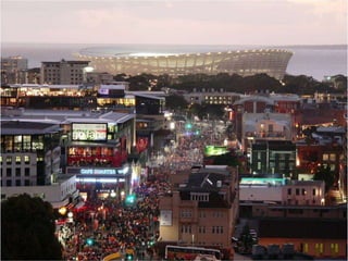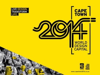 The document discusses bringing people together in Cape Town through creative and cultural initiatives. It outlines communication channels and events used to facilitate networking including Creative Cape Town Clusters. It discusses five goals for 2010 related to the central city including enhancing citizen participation and contributing to Cape Town's unique experience. The document also outlines plans to build upon the 2010 World Cup legacy through various economic, social and cultural projects. It promotes Cape Town's bid to host COP17 in 2011 and discusses implications of related developments like the CTICC expansion for managing the central city as a permanent events arena. It outlines the 2014 World Design Capital campaign strategy of bringing people together through citywide focus on design for transformation.