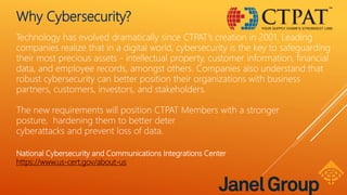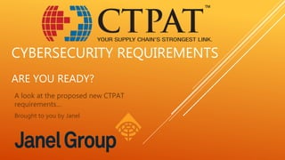 The document discusses proposed new cybersecurity requirements from CTPAT. Technology has evolved since CTPAT's creation in 2001, and companies now realize cybersecurity is key to protecting assets like intellectual property, customer data, and employee records. The new requirements are intended to harden CTPAT members against cyberattacks and data loss. Cyber threats now outrank terrorism as a national security threat. Cyber crimes cost the global economy an estimated $445 billion in 2013 through losses and recovery costs. Companies face average costs of $7.35 million per data breach, with malicious attacks being most expensive. The document provides best practice tips for strong cybersecurity policies, testing network security, and data protection.